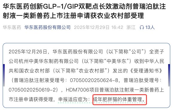就于人们还有于为卷出马甲线而疯狂打卡帕梅拉,或者纠结要不要给肚子来上一针司美时,药企已经经暗暗对于沙发上的“猪咪”下手了。2025年末,华东医药的一纸通知布告,让“猫用减肥药”这个听起来像科幻片的名词,正式进入了农业屯子部的受理流程。